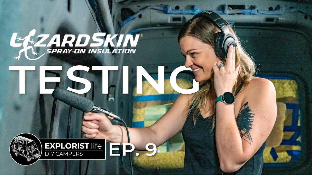 EXPLORIST.life testing sound deadening material after installing LizardSkin spray-on Sound Control coating in their DIY Ford camper van.